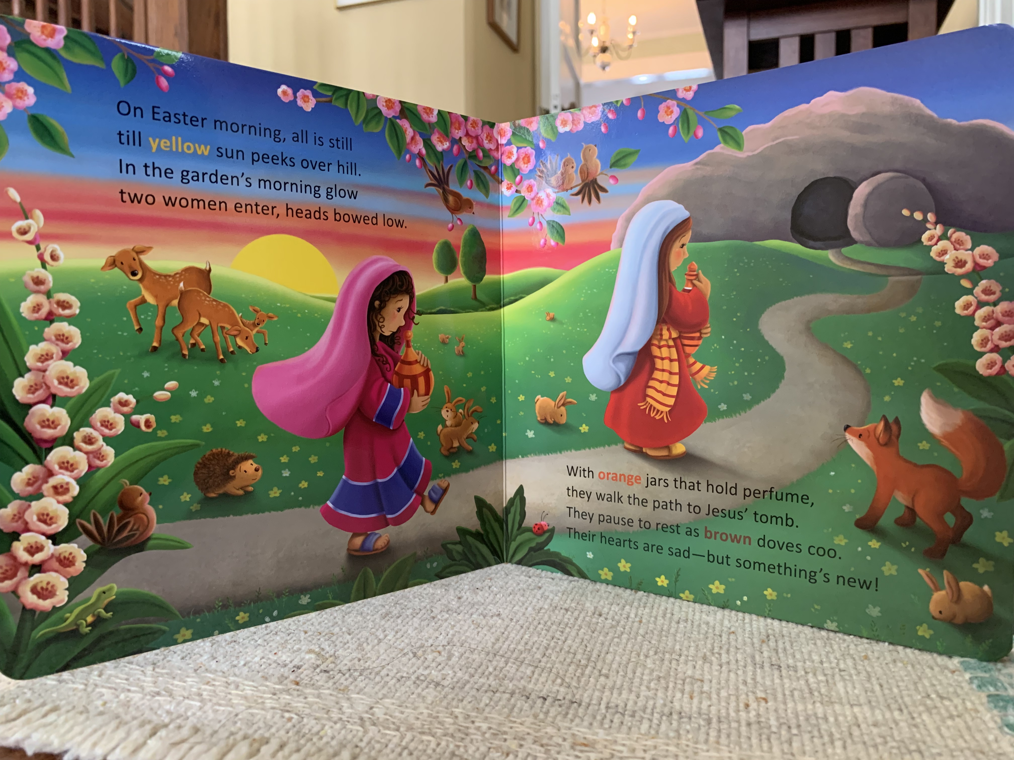 Tip #3: Add simple actions and/or sounds. In Happy Easter, Risen King! for example, you could have your children squeak like the little mice that appear in almost every spread. For actions, they could pretend to carry jars of perfume or to be picking up petals along the path in the story.