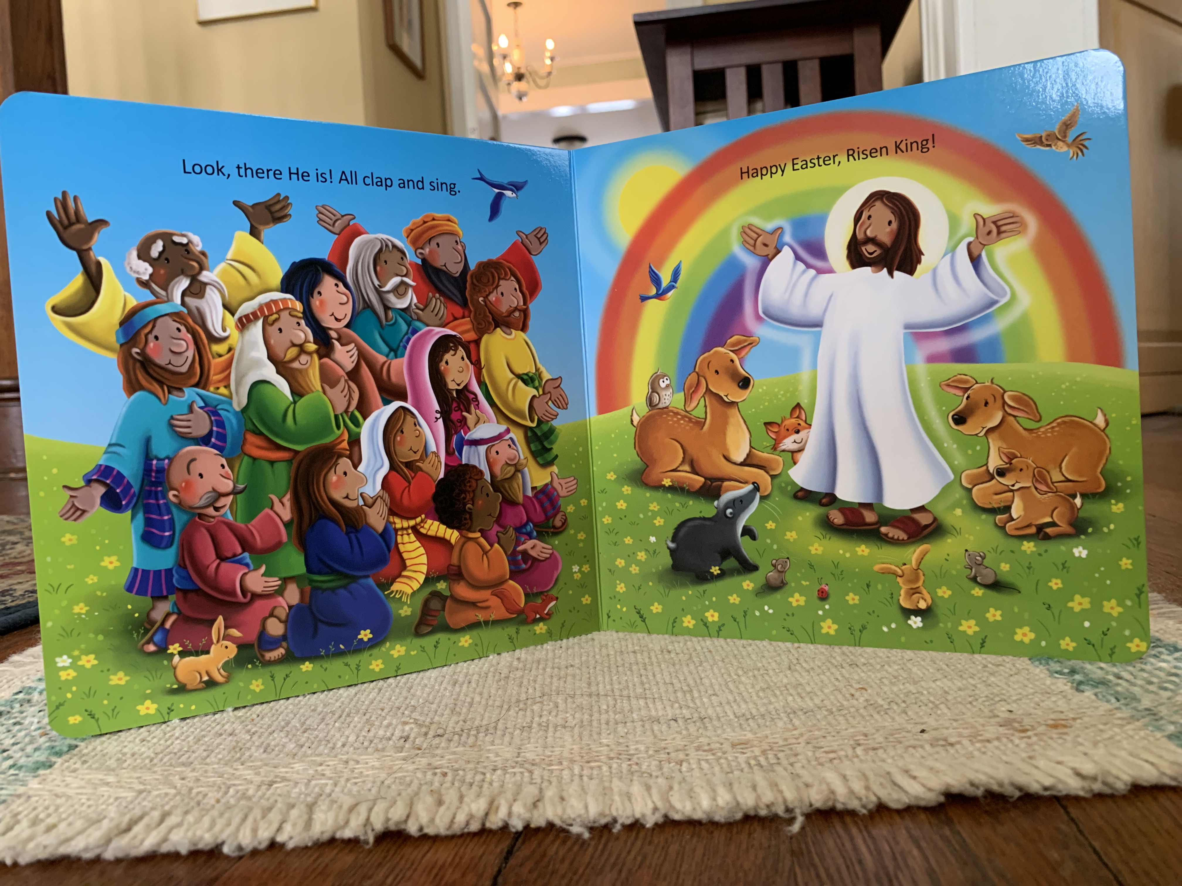 Tip #2: Pause as you read to ask simple, interactive questions. In Happy Easter, Risen King! for example, you could ask: “Where’s the sun?” “Who is in the garden?” “What’s the angel doing?”