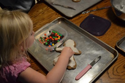 But we still made a big mess, gobbled too many decorations, and spread icing far and wide. One nice thing about decorating cookies instead of houses was that we could eat our work instead of letting it sit around and petrify into cement.