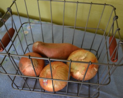 We are down to wilted celery, one sweet potato, a few onions, and garlic. Oh, I think there may be a dried up bit of ginger hanging around as well and some frozen peas and corn. Almost out of milk, yogurt, and bread.