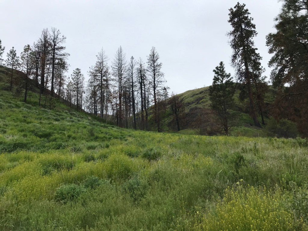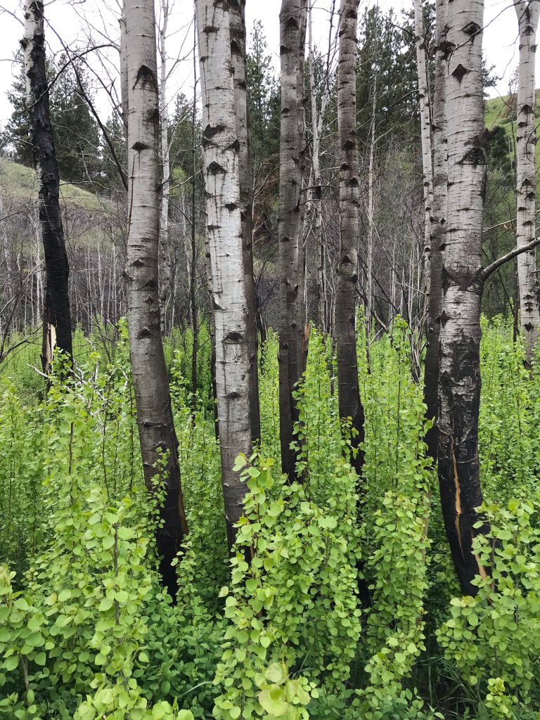 Evidence of a previous fire lines both sides of the trail. I found the stark black a beautiful counterpoint to the spring greens and gray bark.