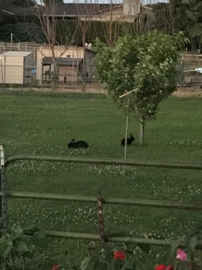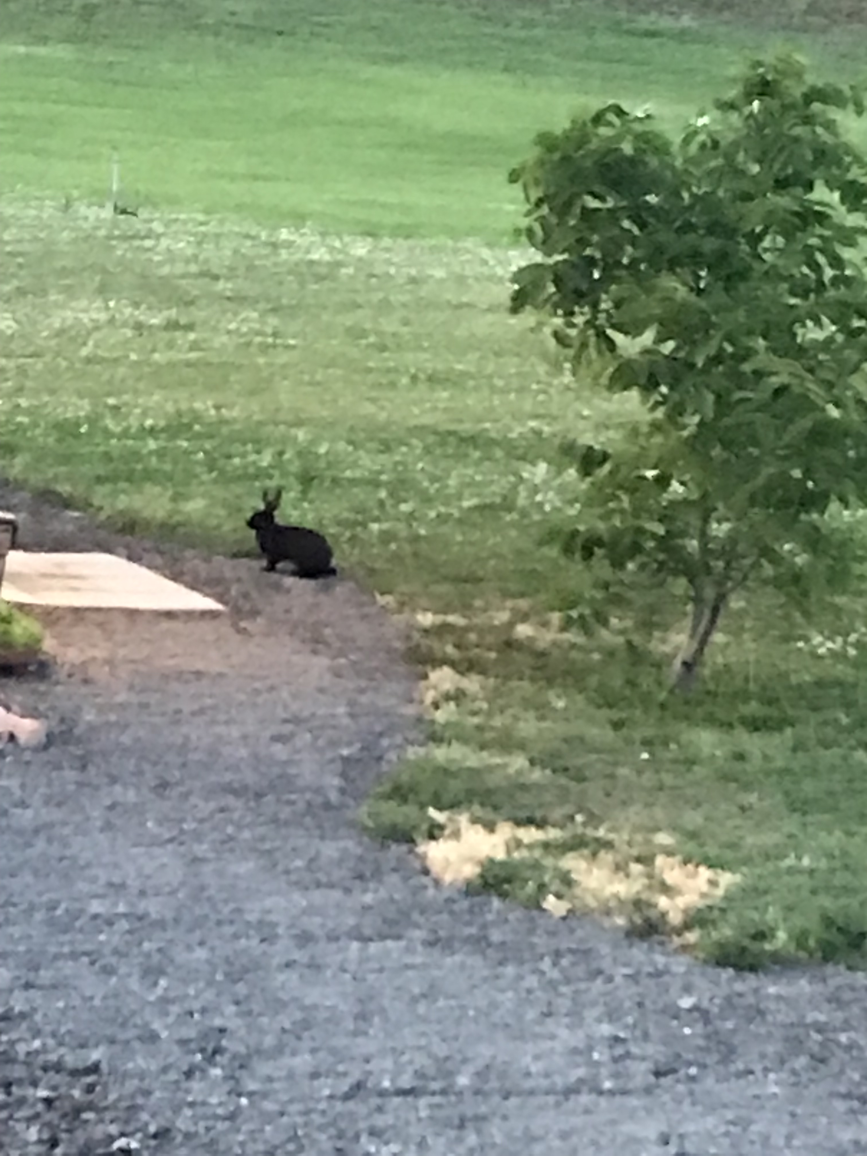 We have bunnies (formerly known as pets). People have dumped them. So now between the neighbors and us, we have a colony. A fluffle. We are happy that most of them live beneath the neighbor’s outbuildings (while 4 live at Taylor and Jamie’s as actual pets). But the green pasture is alluring. And the used-to-be growing garden a delight.