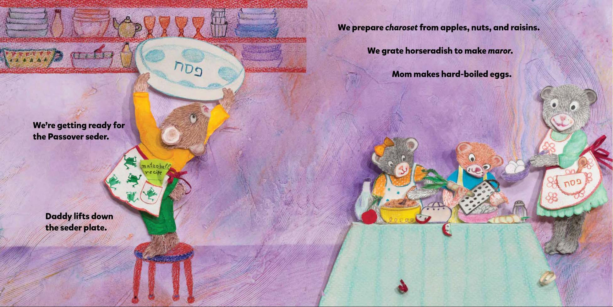 A family of bears is getting ready for the Passover seder, preparing all the items for the seder plate. When the time comes in the seder for hiding the afikomen, Grandma breaks the middle matzah into two pieces. She hides the bigger piece, the afikomen, that the kids will eagerly search for later in the seder. It’s a good thing one little bear has turned his toy elephant into an Afiko-Sniffer! The invention sniffs out apples in a bowl, eggs in the fridge, and horseradish in the pantry, but can it help find the afikomen?