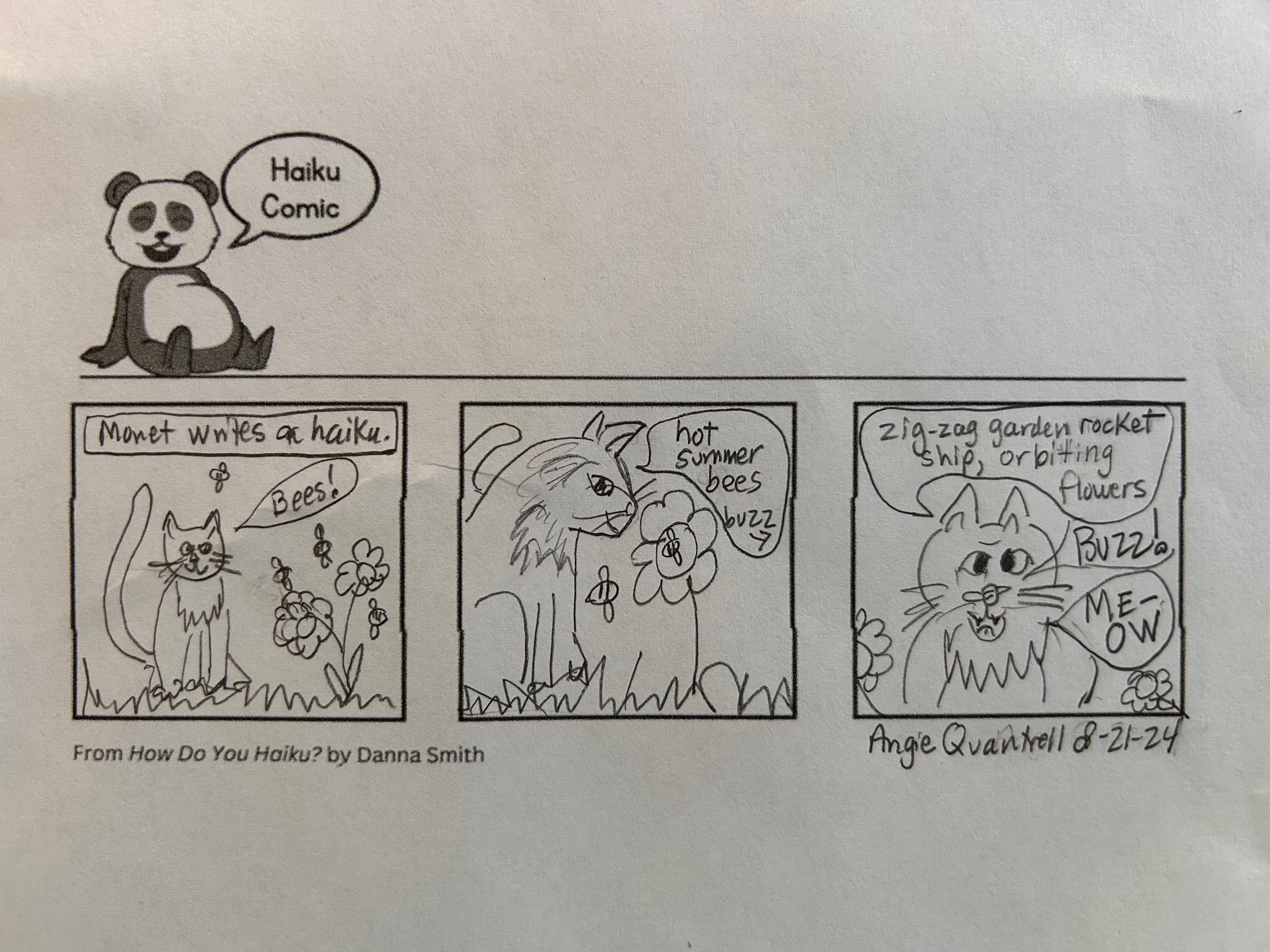 But first. I had to play. I used the template Danna shared and penned a haiku comic. Sadly, you have to use your imagination to understand the drawings, and it was much harder to print small words than it looks! This is Monet, our cat. She loves the garden and watching moving things. I assure you, she is much prettier in real life.