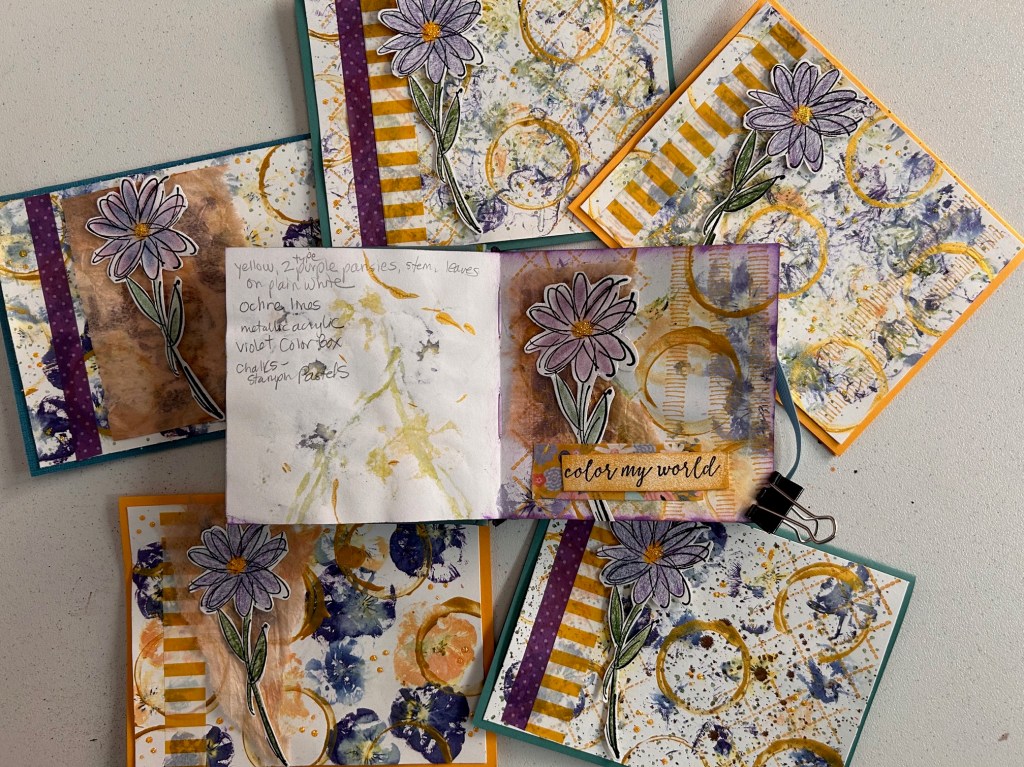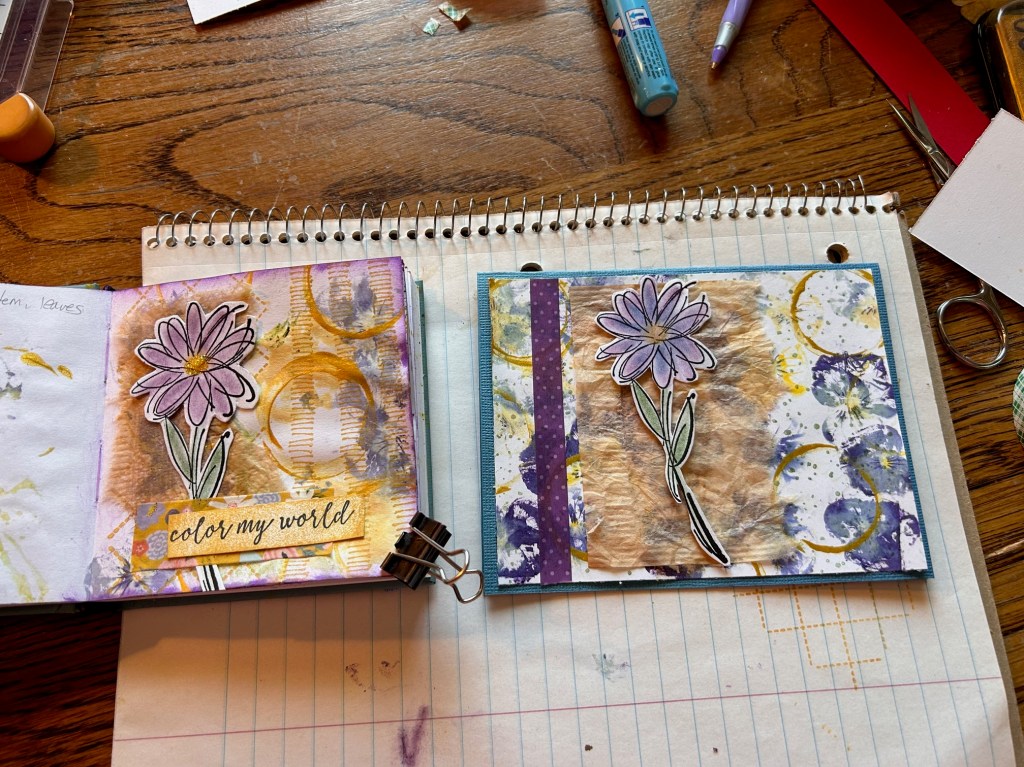 I did one page in my mixed media journal, combining a bunch of inks and “stuff.” And I experimented with card-sized cardstock, which turned out well, but it takes MANY flowers to fit on one of those (I did 5 card fronts). Hammering flowers is a workout! My honey was outside and thought someone in the neighborhood had their bass up too loud. LOL.