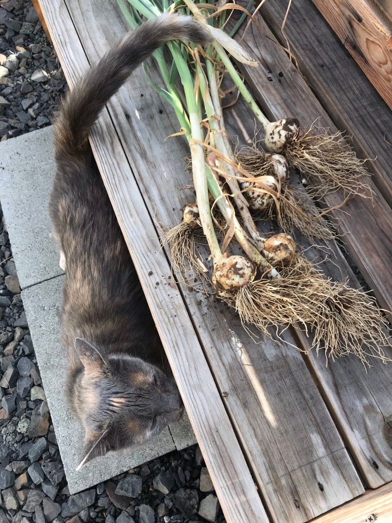 The garlic was a surprise from last year. I think. I’m forever popping sprouted garlic cloves in a garden bed or patch of ground. Usually, they are eaten before I get anything useful. This spring, for the longest time, the middle bed had only this big bouquet of garlic greens. Finally, after the complimentary squash plants over grew it and scapes started growing, I could tell they were done. I pulled them out and we actually have garlic! Also drying with the onions.