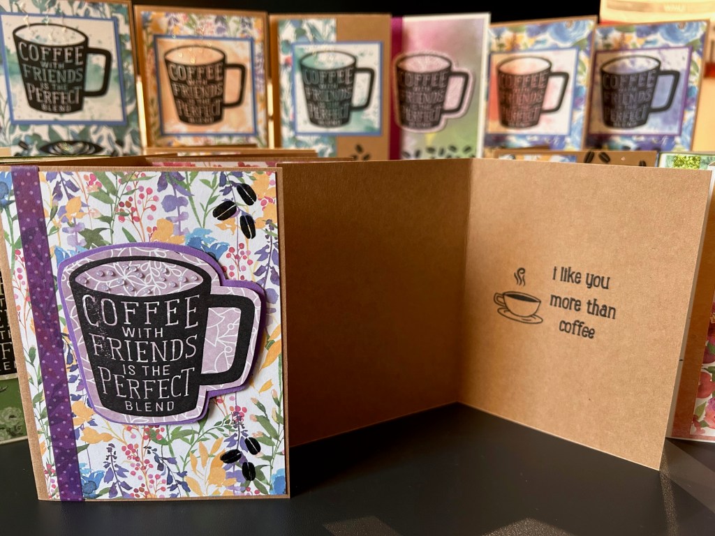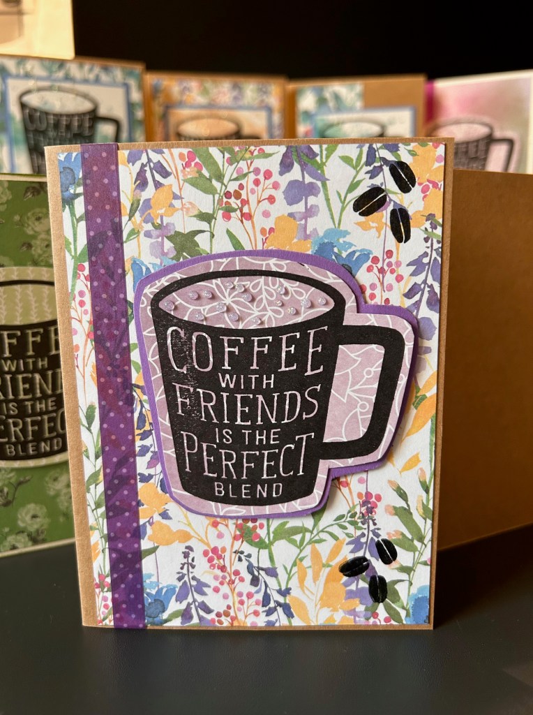 It was coffee. Coffee jumped out. This fun coffee cup rubber stamp set was just the thing. Add some fun papers, a bit of this and that, and 14 time for coffee with friends cards are now drying on my desk.