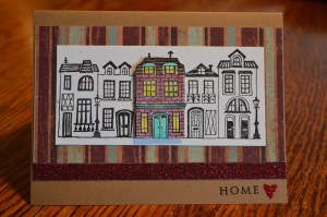 I love these stamps! The background paper worked very well. Alas, this card was a lesson in which ink pad NOT to use! The ink never dried, so I had to carefully place scraps of paper between each card to bring them home. And then it still wouldn’t dry! I finally had to peel off the fronts, remove the backings, and re-ink the edges. Sigh. I just need to toss that ink pad. Black ink. Everywhere.