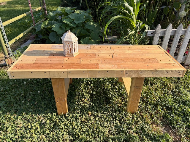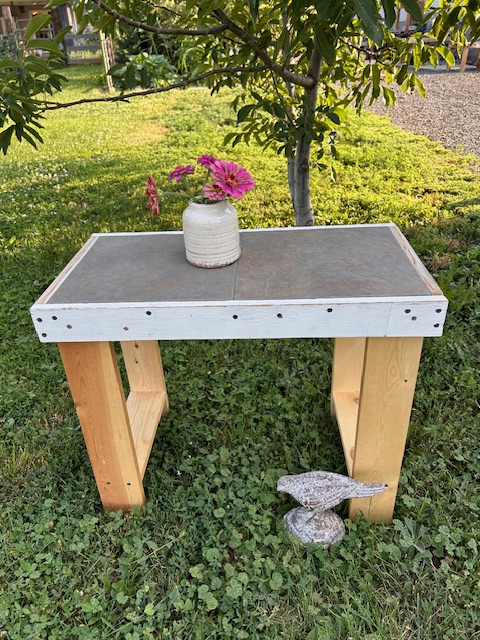 Above is the first harvest of the minis. So cute and adorable, and perfect for every nook and cranny. I will definitely plant these again. They are so much fun, and pretty aggressive climbers. We watched them creep up sunflowers, pine trees, and any other item taller than themselves. Note, this is another table made by the honey. This one is fresh and needs weathering.