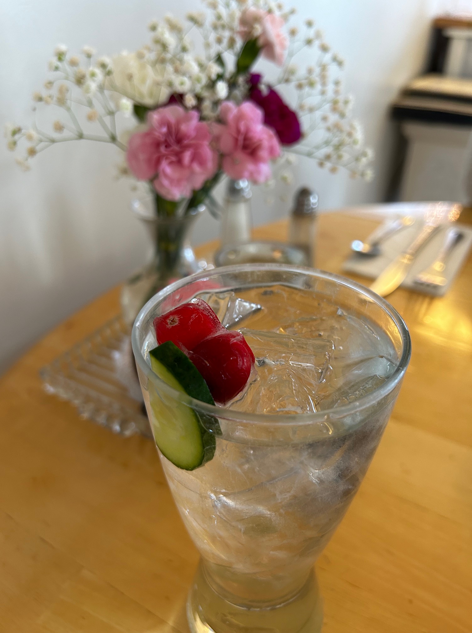 Even the water glasses were delightful. Look at those little heart-shaped cranberry ice cubes with a wedge of cucumber. Mmm.