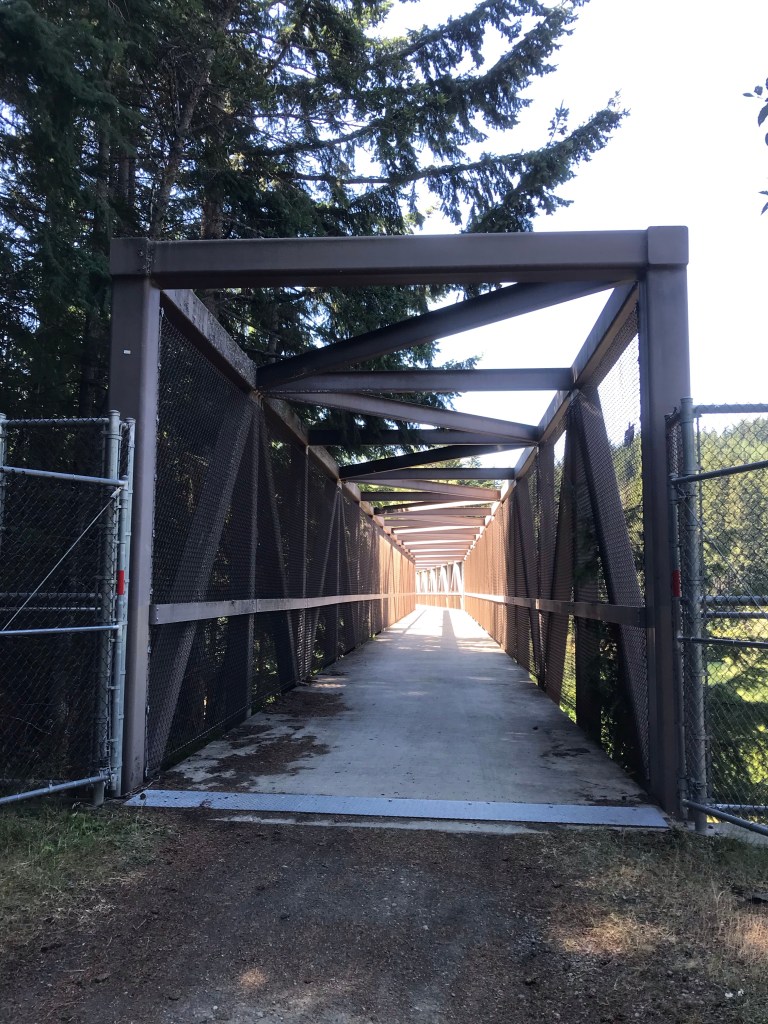 I’m standing between the Burlington Northern Santa Fe (BNSF) railroad tracks. Continue over the tracks, easing right (not left like we did at first) around another corner and you will see a sign leading you to the Palouse to Cascades Trail. It looks like a road. Great for walking!